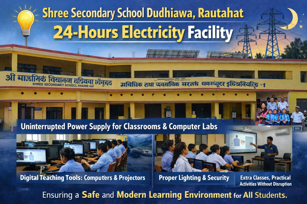 Shree Secondary School Dudhiawa, Rautahat provides a 24-hours electricity facility to ensure a safe, comfortable, and modern learning environment for students and staff. Continuous electricity supply supports the effective use of classrooms, computer labs, and administrative offices throughout the day. It allows teachers to use digital teaching tools such as computers, projectors, and multimedia resources, making learning more interactive and practical.
